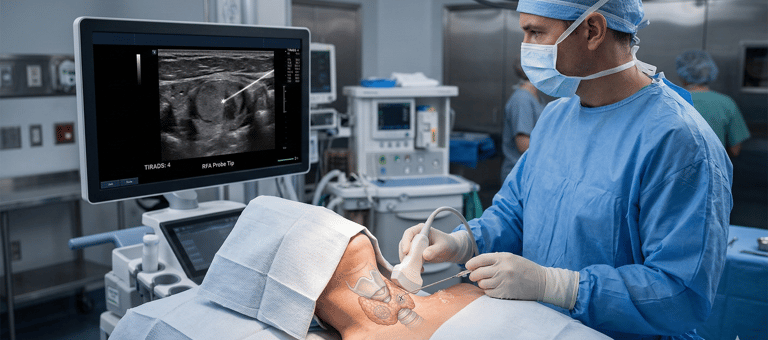 A radioablação utiliza uma fina agulha especial, guiada por ultrassom, para aplicar energia diretamente no nódulo. Essa energia provoca o aquecimento controlado das células, levando à sua destruição e consequente redução de volume ao longo das semanas e meses seguintes.